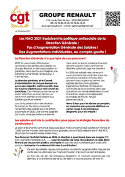 Ce 21 février 2021 s'est tenu la seconde et dernière réunion de Négociation Obligatoire Annuelle (NAO) l'un des sujets qui doivent êetre abordés (et le seul qui l'est chez Renault) porte sur l'évolution des rémunérations.