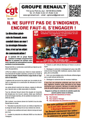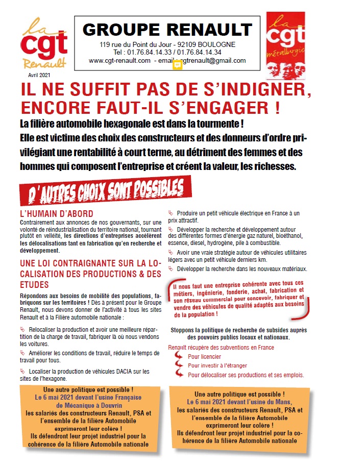 Les syndicats CGT du groupe Renault, la Fédération des travailleurs de la métallurgie (FTM-CGT) appellent à une grande mobilisation des salariés le 6 mai 2021. Pour les établissements Ile de France de Renault, cette mobilisation aura lieu devant l'usine du Renault Mans.